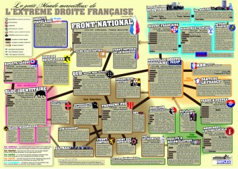 Dur dur la vie de bricablogueur ! Si je n’étais pas aussi attentif, j’aurais pu rater l’excellent travail de compilation réalisé par JEA sur « Mo(t)saïques » à propos des relations entre le coq du clocher gaulois et les zétrangers, à l’occasion notamment du débat sur le droit de vote des mêmes zétrangers. A lire impérativement, car les citations choisies ne manquent pas d’intérêt. Le titre de la chronique dit bien ce qu’il veut dire : « La course en zigzag d’une droite française à travers les champs xénophobes du FN « . Parmi les citations choisies, certaines prêteraient même parfois à sourire si elles ne traitaient pas d’un sujet aussi grave. Un échantillon ? Cette déclaration de Xavier Vallat (commissaire aux questions juives au temps du gouvernement de Vichy) : « En France, nous sommes chez nous, les étrangers ne peuvent y être que des invités, des visiteurs ou des domestiques. » Ce Monsieur exagérait sans doute puisque, dans notre pays, des réfugiés hongrois arrivent à exercer finalement d’assez hautes responsabilités… à moins que, dans ce dernier cas, on considère qu’il ne s’agisse que d’un emploi de laquais au service de la haute finance… Je vous laisse juge… Il est important, en ces périodes de confusionnisme politique poussé, de bien faire attention à démêler l’écheveau politique que l’extrême-droite semble prendre un sacré plaisir à tisser… L’araignée guette derrière sa toile et cherche, en jouant sur les mots, à piéger des électeurs potentiels dont les idées ne sont pas très claires… Toujours se méfier des slogans ou des idées vendues en « prêt à porter » qui, parfois, rassemblent des gens n’ayant pas vraiment les mêmes fondamentaux… Sur le site « Reflex », un schéma proposé dans le cadre d’un article intitulé « l’extrême droite, mieux la connaître pour mieux la combattre« , vous donnera une idée de la complexité des réseaux. Ce schéma peut-être téléchargé en Pdf et donc agrandi (cliquer sur l’image).