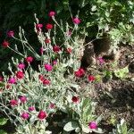 D’autres fleurs se font plus discrètes, mais leurs couleurs pastel attirent quand même le regard : le bleu des scabieuses du caucase (5) se marie admirablement avec le vieux rose d’une fleur méconnue, le lychnis ou croix de Jérusalem (9). Comme la julienne des dames ou le phlox, c’est là une plante typique pour un « jardin de curé » délicieusement désordonné. Dans leur coin, les coquelourdes ont fini par fleurir (4) et leur rouge sombre est merveilleusement mis en valeur par le gris-vert pâle de leur feuillage duveteux. Les œillets de Chine (3) se sont acclimatés dans le jardin et réapparaissent chaque année. J’espère qu’ils ne m’en voudront pas trop de les citer en dernier !