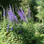Un mois auparavant, il y avait relativement peu de fleurs ouvertes. Ce n’est plus le cas maintenant : les delphiniums (pieds d’alouette) étalent leurs clochettes d’un bleu éclatant (8) et, dans le massif des lupins, ce sont les digitales (6) qui ont pris le relais : c’est la fête pour les abeilles et autres butineuses qui disparaissent dans les chapeaux colorés et ressortent ivres de pollen. Lorsqu’elles en ont terminé avec les clochettes, elles s’envolent à tire d’aile vers le tilleul (2) dont le parfum embaume sur plusieurs mètres alentour. Les roses sont resplendissantes (11) sous le soleil, mais font un peu grise mine lorsque la pluie se fait trop insistante. Leur robe délicate n’apprécie guère les arrosages trop violents.