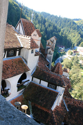 Après Sibiu, nous avons décidé de poursuivre notre tour de la Transylvanie en nous rendant à Brasov, au centre de la Roumanie. Avant de rejoindre ce centre historique important, nous avons fait un détour, incontournable selon les guides touristiques, par le fameux château de Bran, l’un des « piliers » de la légende de Dracula. Les historiens ont pu démontrer, sans problème, qu’il ne s’agissait là que d’élucubrations d’agences touristiques en mal de communication, Vlad III, le personnage qui a inspiré le mythe du prince des vampires, n’ayant probablement jamais mis les pieds au château. Pour les marchands de souvenirs qui s’entassent au pied du monument, ou pour les fabricants d’enseignes publicitaires, cela ne fait aucun doute en tout cas. Quand on traverse le petit village de Bran, on croirait pénétrer dans un « Lourdes » spécialisé vampires. Le sang coule à flot, de l’enseigne des bars restaurants, aux différents hôtels, en passant par les cartes postales et autres chopes à bière toutes plus hideuses les unes que les autres. C’est un peu dommage car le château, une fois délivré de ce carcan de pacotille, est très intéressant à visiter. Son architecture complexe à l’extérieur, se traduit par un véritable labyrinthe de couloirs, escaliers, alcôves et salles à l’intérieur. Le décor est, sans nul doute, très cinématographique. Il faut parfois patienter ou jouer du coude pour faire une photo intéressante tant les visiteurs se bousculent à l’intérieur, et pourtant, nous ne sommes plus en pleine saison touristique !